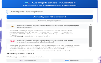 Compliance Auditor, web içeriğinizi, e-postalarınızı ve iş tanımlarınızı anında analiz ederek kritik uyumluluk sorunlarını ve önyargı meselelerini tespit eden bir Chrome eklentisidir. Kullanıcıların GDPR, CCPA gibi düzenlemelere uyumunu sağlamak için tek tıklamayla denetim yapmalarına olanak tanır. Ayrıca, yaş, cinsiyet, ırk gibi konularda potansiyel ayrımcı dil tespit eder ve kullanıcıların bu sorunları hızlıca görmelerini sağlar.